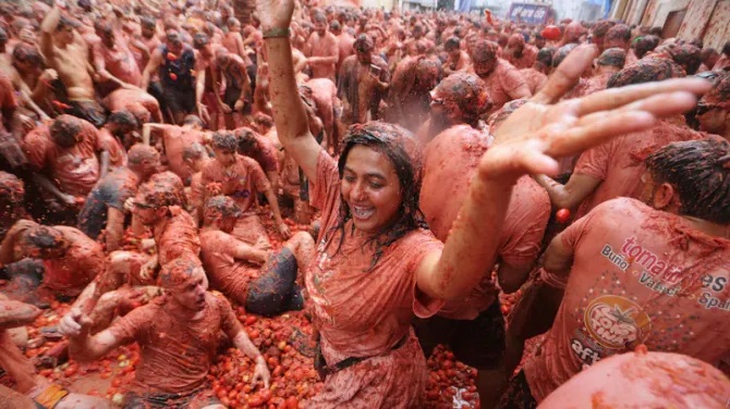 В іспанському місті Буньйоль, розташованому у провінції Валенсія, відбувся традиційний фестиваль Ла Томатіна, який цьогоріч залучив 22 тисячі гостей з різних країн світу. За одну годину центральна вулиця міста перетворилася на арену масштабної «битви» перестиглими помідорами.
