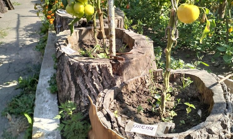 Михайло Ігнатюк вирощує томати вже кілька років, розповідає agroter.com.ua, використовуючи незвичний спосіб - у зрізаних пеньках дерев. За його словами, рослинам там комфортніше, ніж у відрах чи відкритому ґрунті. Усього має близько 15 сортів томатів, найулюбленіший – «Президент».
