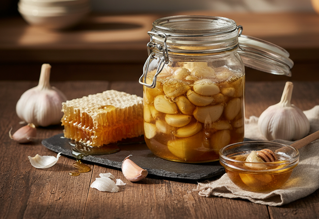 Зубчики часнику треба покласти у чисту суху банку з широким горлечком і залити медом так, щоб він повністю покрив часник. Якщо ви вирішили додати трав, їх також потрібно повністю занурити у медову масу. Накрийте кришкою, але не закручуйте, адже буде відбуватися легкий процес бродіння, під час якого будуть виходити гази.