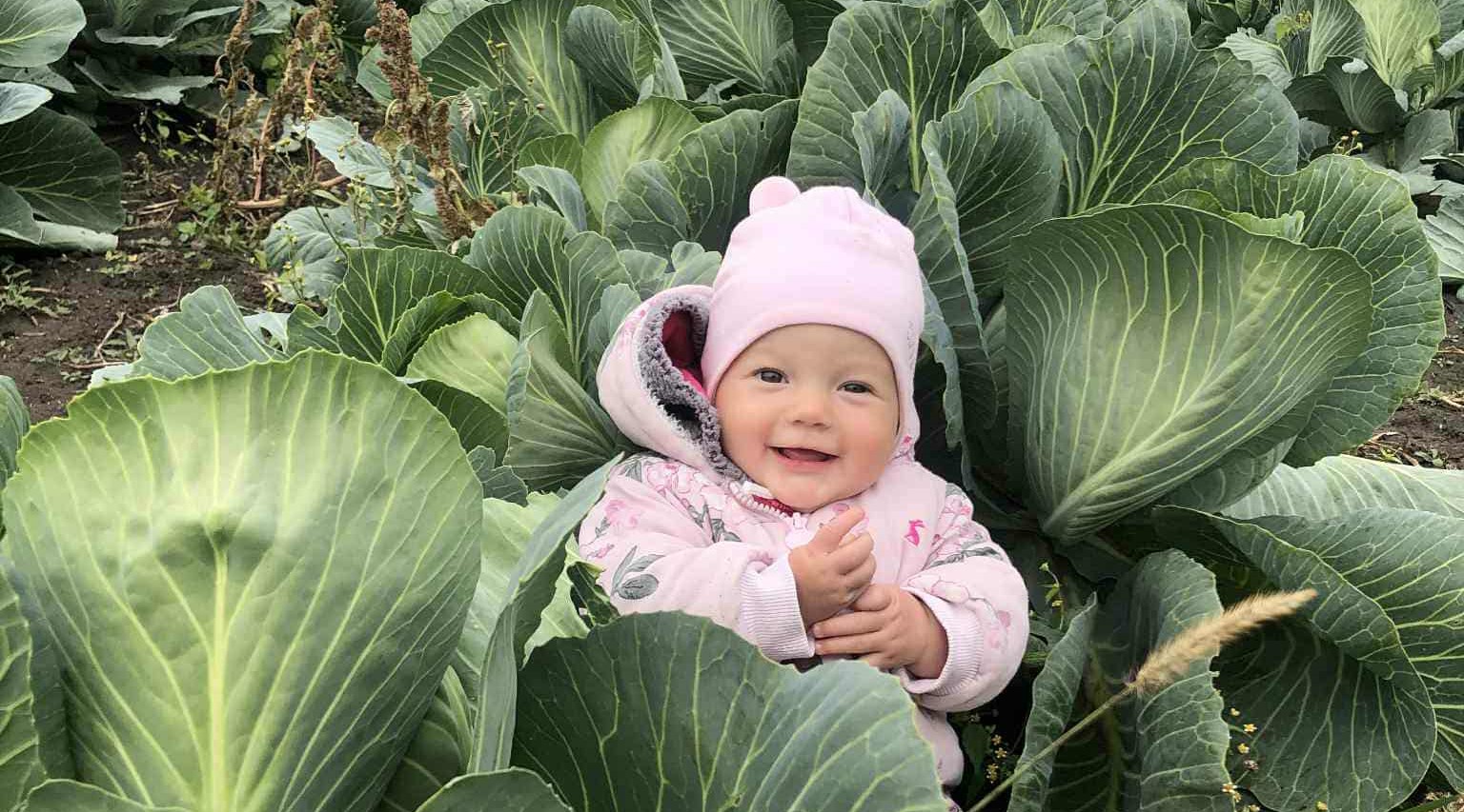 З цікавістю спостерігає за тим, як збирають урожай зимової капусти. А поки Інночка допитливо дивиться за працею дорослих, ми розповімо як правильно збирати і зберігати пізню капусту.