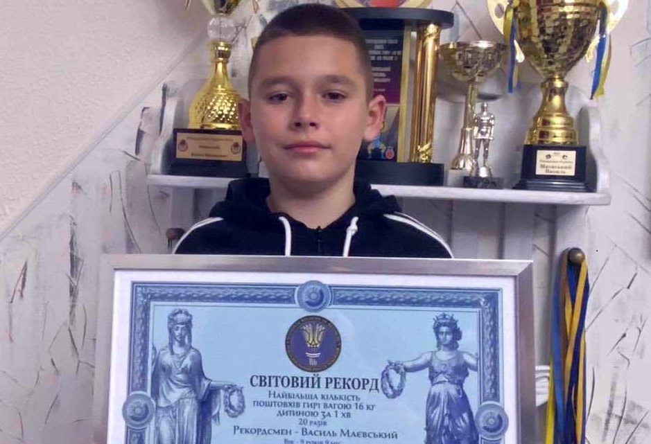 12-річний Василь Маєвський з Мукачева встановив національний і світовий рекорди з гирьового спорту – він зробив 16 поштовхів гирі вагою 32 кілограми. Про це повідомила очільниця Національного реєстру рекордів України Лана Вєтрова.