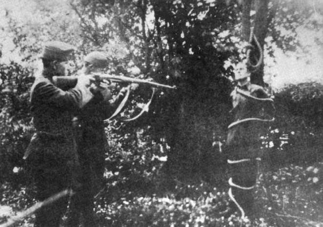 На світлині: мадярські нацисти розстрілюють січовика, весна 1939 року, Закарпаття.
