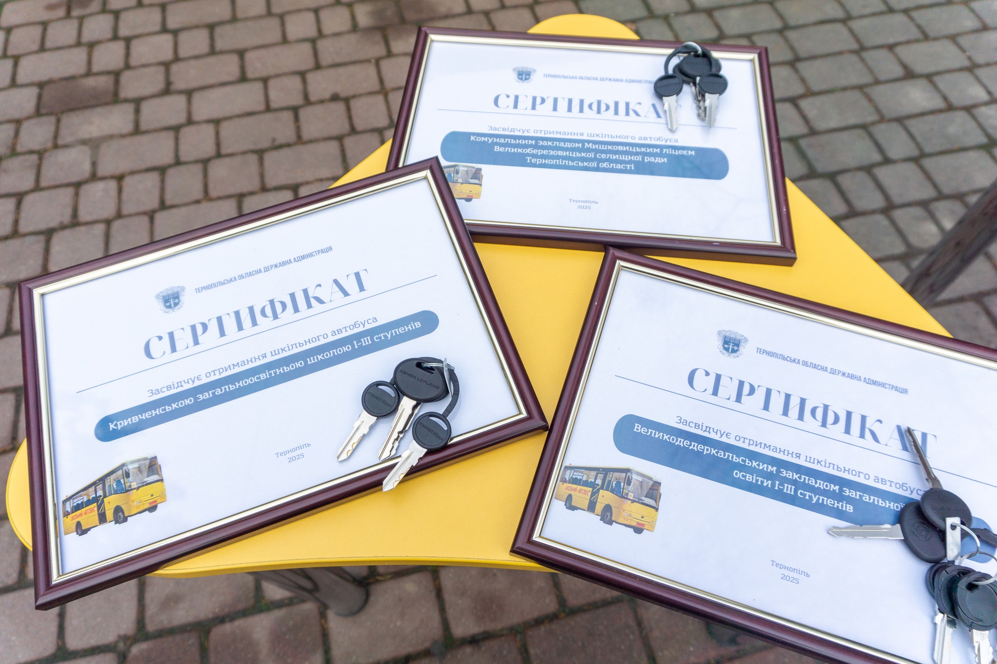 На Тернопільщині триває масштабна модернізація шкільного автопарку. Сьогодні заступник начальника Тернопільської ОВА Павло Журба передав ключі та сертифікати на 6 шкільних автобусів для Борщівської, Великоберезовицької, Великодедеркальської, Золотниківської, Залозецької та Копичинецької територіальних громад.