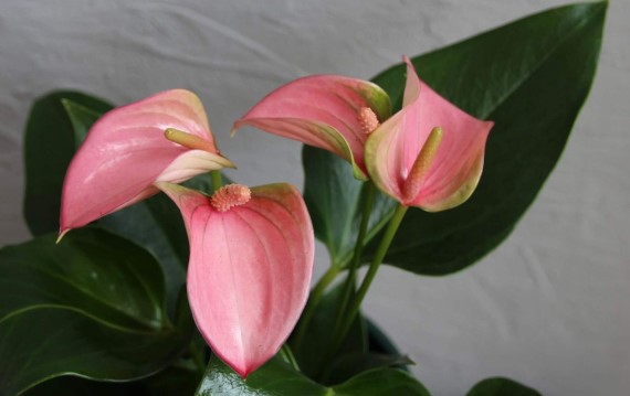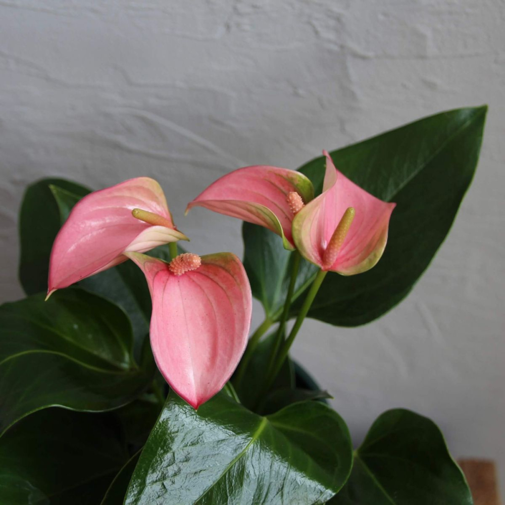 Відомий як квітка фламінго, походить з Америки та славиться своїм блискучим листям у формі серця та яскраво-червоними, рожевими або білими китицями, що нагадують квіти. Антуріуми віддають перевагу злегка підсихаючому ґрунту між поливами. Регулярне підживлення протягом вегетаційного періоду забезпечить їм цвітіння цілий рік. Їх вражаючий зовнішній вигляд виділяє їх у ванних кімнатах або на засклених верандах.