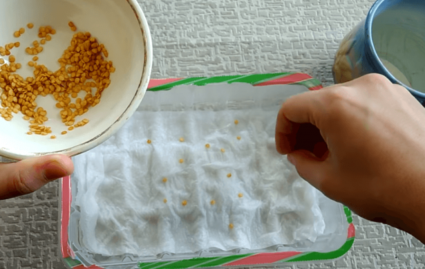 Далі потрібно дістати посівний матеріал та створити для нього вологе середовище з доступом до кисню. Для цього візьміть ватний диск чи паперову серветку та змочіть її теплою водою температурою 25-28 градусів. Розкладіть насіння на одну половину серветки, а іншою – накрийте. Покладіть насіння у пакет чи контейнер, аби створити парниковий ефект, і залиште в теплому місці.