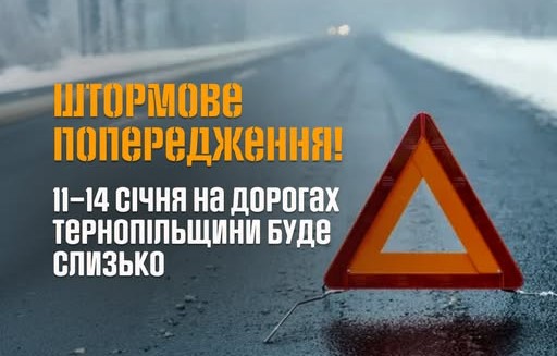 На Тернопільщину йде серйозна ожеледиця. З 11 по 14 січня дороги перетворяться на ковзанку. Синоптики дають «жовтий» рівень небезпеки, а Головне управління ДСНС України в Тернопільській області дає просту, але дієву пораду: не впевнені - не виїжджайте.