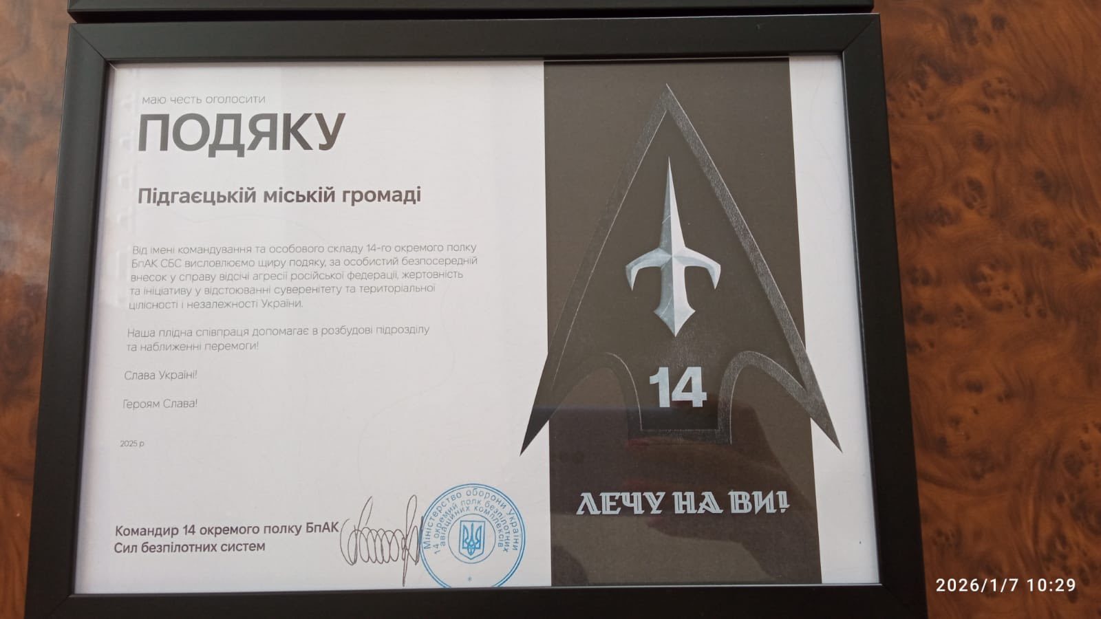 – Днями бійці 14-го окремого полку безпілотних авіаційних комплексів Сил безпілотних систем Збройних сил України передали подяку і бойовий прапор Підгаєцькій громаді, депутатському корпусу та всім, хто допомагає наближати мир. Для нас це не просто відзнака, а символ великої відповідальності, єдності та міцного зв’язку між фронтом і тилом.