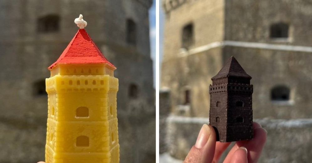 За її словами, свічки у вигляді вежі уже роблять кілька років. Шоколадні фігури поки що тестують: «Нам виготовили 3D модель східної вежі замку. Зробили форму. Висота цієї свічки - 15 сантиметрів. Її можна розглядати зблизька й ознайомитися з виглядом. Цю вежу з чотирьох обрали тому, що в неї прямі стіни, їх легше відтворити у формі».