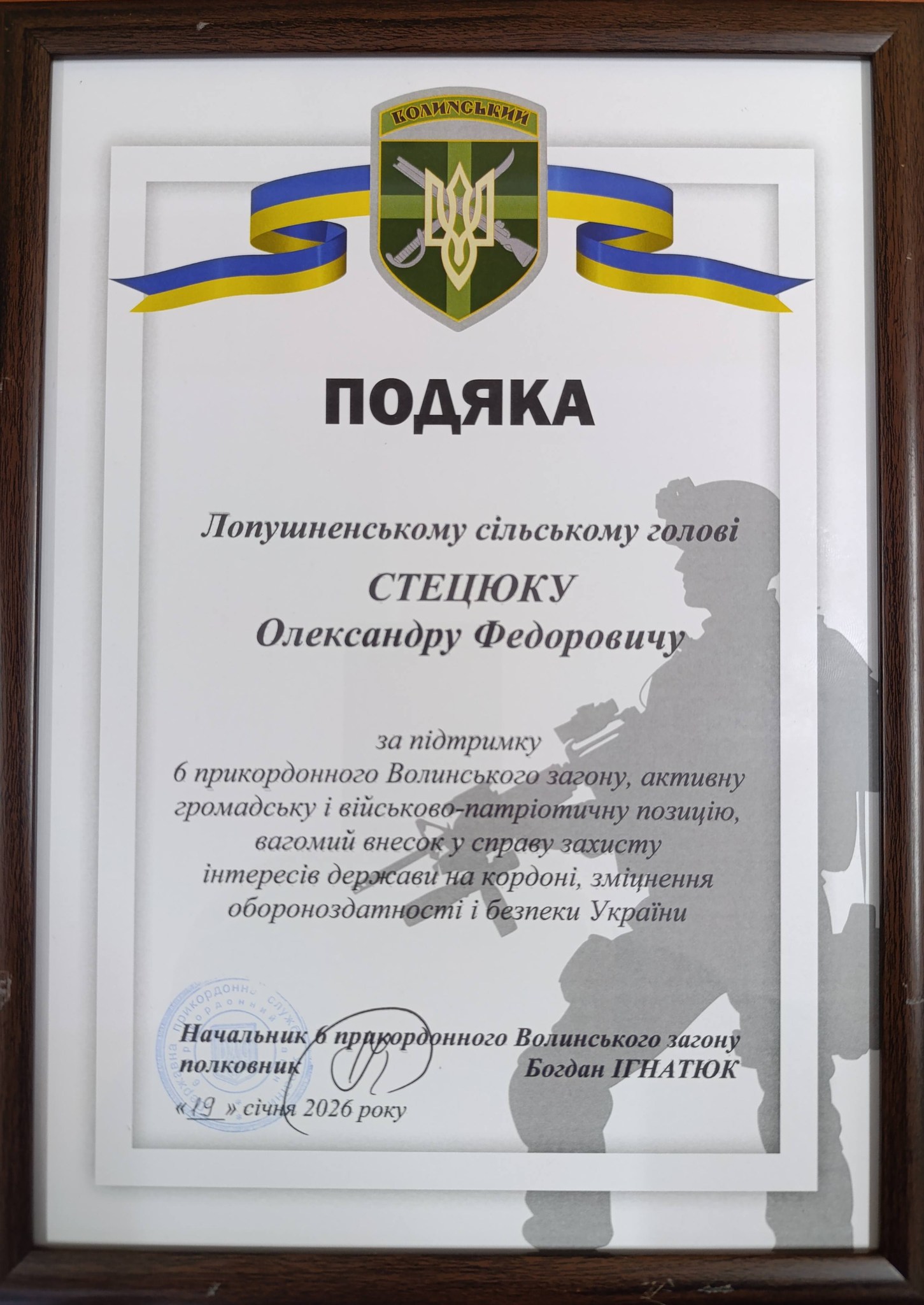 Очільник громади отримав подяку від 6-го прикордонного Волинського загону, який виконує надскладні завдання на передових рубежах, і стабільна допомога з тилу є критично важливою для бійців. Зрештою, у подяці сказано «…за підтримку 6 прикордонного Волинського загону, активну громадську і військово-патріотичну позицію, вагомий внесок у справу захисту інтересів держави на кордоні, зміцнення обороноздатності і безпеки України».