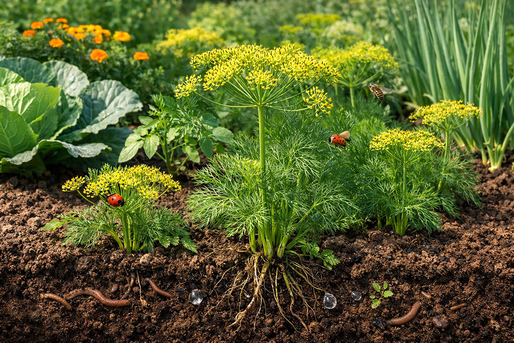 Кріп має сильний аромат, який діє як натуральний репелент. Він відлякує частину шкідників і одночасно приваблює корисних комах. Завдяки цьому на городі формується більш збалансована екосистема, і рослини менше страждають від пошкоджень.