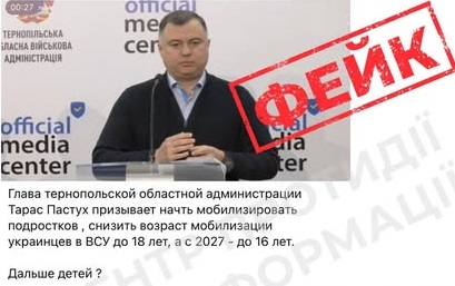 Тут розповіли: російська пропаганда поширює фейкове відео, в якому нібито голова Тернопільської ОВА Тарас Пастух запропонував знизити мобілізаційний вік до 18 років, а згодом - і до 16.